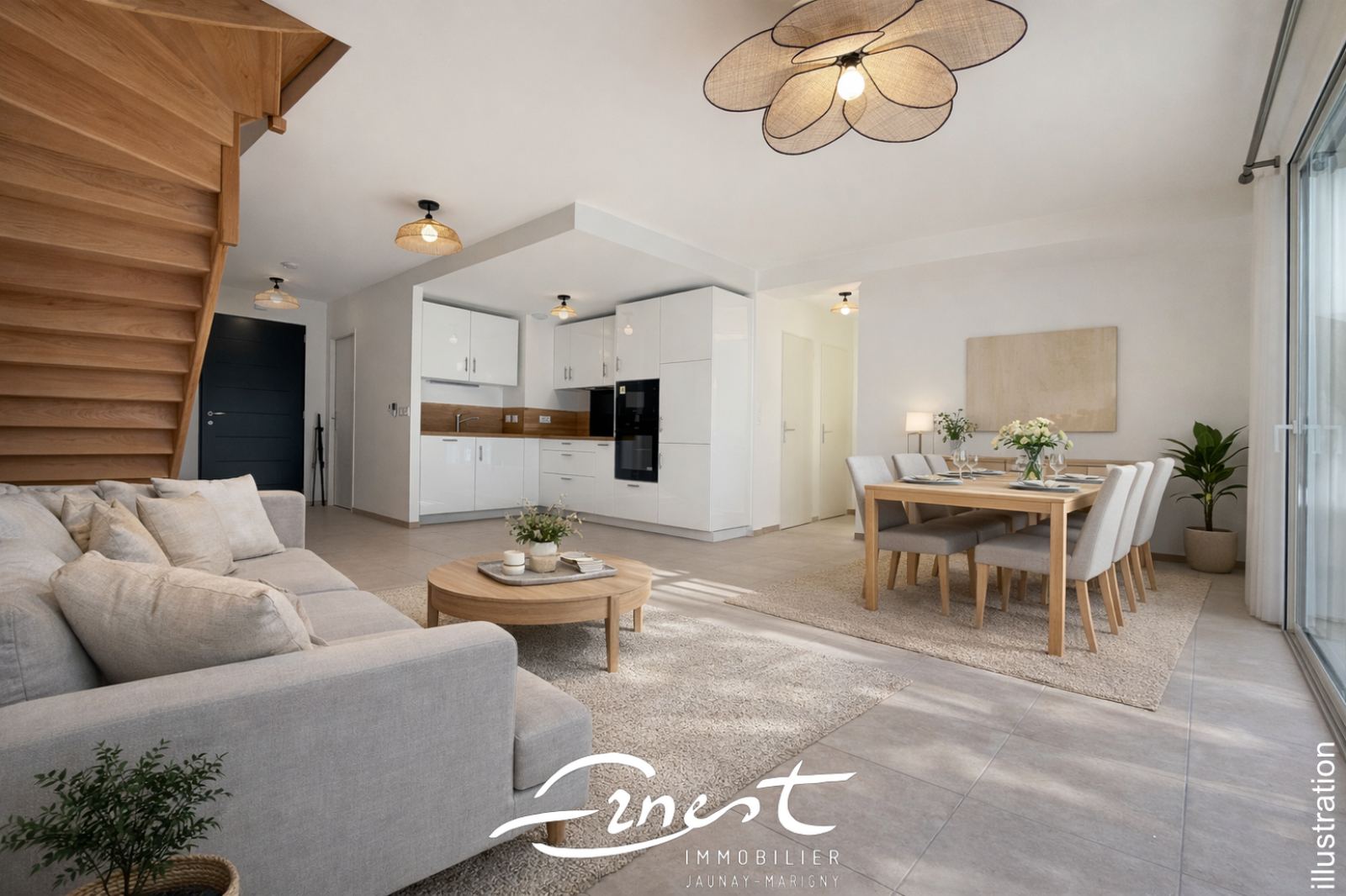 Située à 250m du centre-ville, cette maison neuve séduit par sa lumineuse pièce de vie ouverte sur une cuisine entièrement aménagée et équipée. Elle comprend trois chambres, dont une en rez-de-chaussée avec sa propre salle d’eau. À l’étage, les deux autres chambres disposent d’une salle de bains avec WC. Un cellier et un garage double complètent ce bien.
