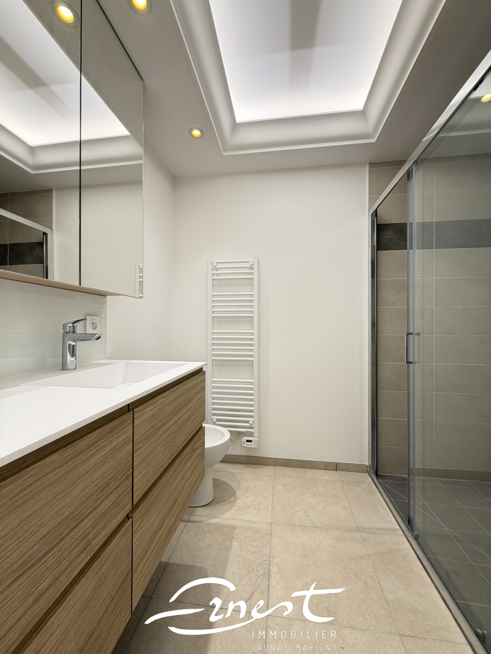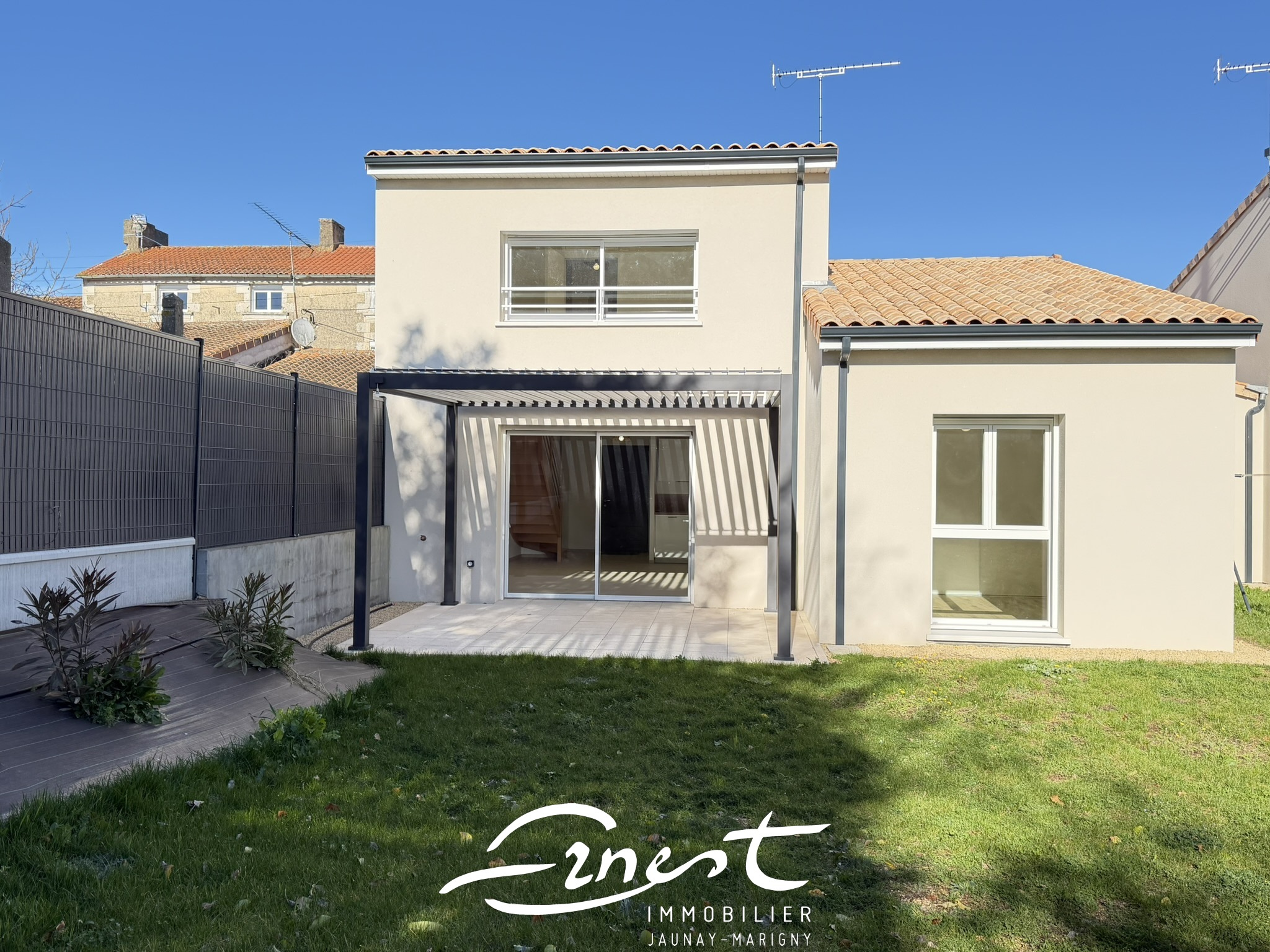 À l’extérieur, vous profiterez d’une agréable terrasse agrémentée d’une pergola bioclimatique donnant sur un jardin entièrement clos.