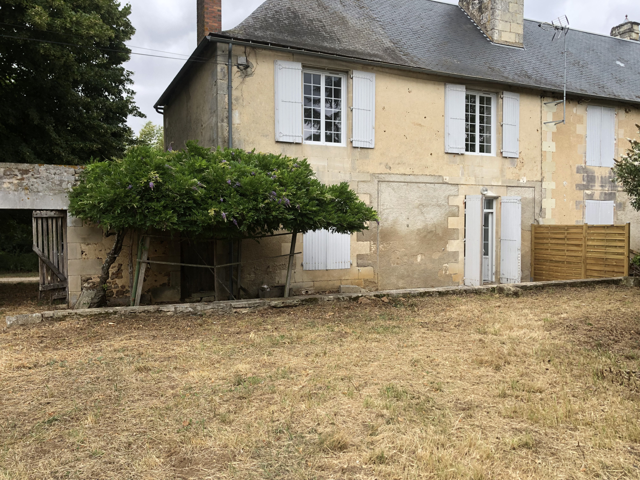 Espace extérieur avec grand jardin et terrasse.