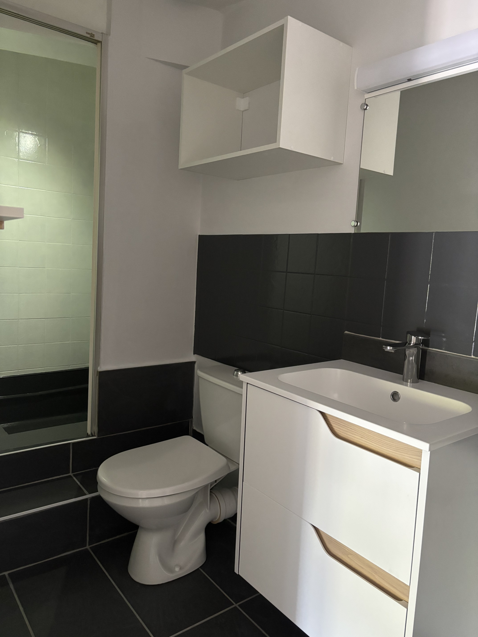 Studio composé d'une pièce de vie avec cuisine éménagée et salle d'eau avec wc. Libre.