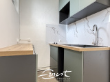 Appartement T3, répartie sur deux niveaux, offre au rez-de-chaussée une cuisine ouverte sur un salon, une salle de bains avec WC ainsi qu'une première chambre.