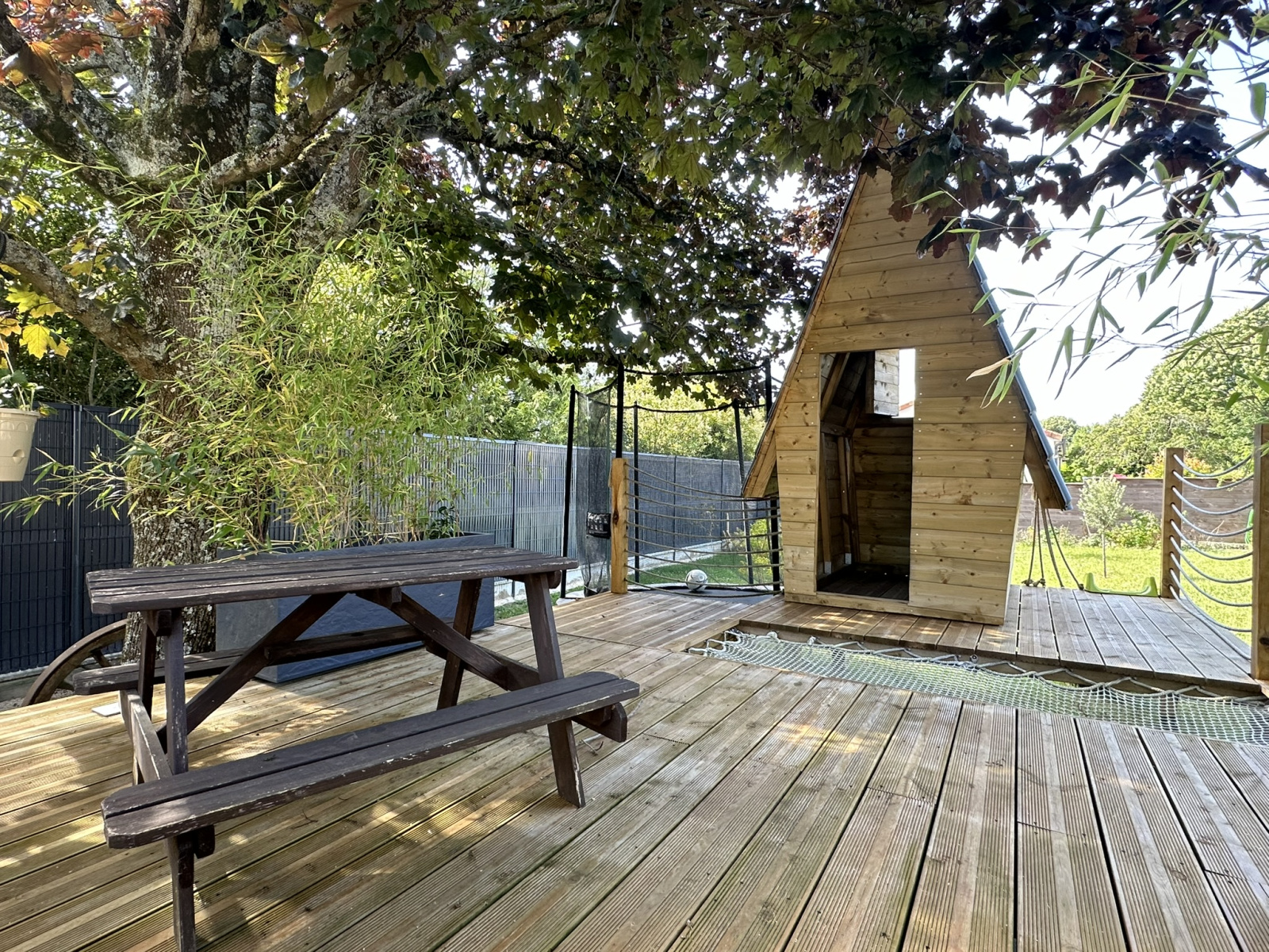 Ici, tout se fait à pied ! Dès les premières secondes vous serez séduits par cette splendide pièce de vie d'environ 90m² avec sa cuisine aménagée et équipée, un coin salle à manger et un grand salon avec poêle à granulé. La terrasse en bois vient agrémenter et directement prolonger l'espace de vie sur l'extérieur. Toujours au rez-de-chaussée vous trouverez une suite parentale avec chambre et salle d'eau, une buanderie, un wc, une cave et un accès sur le double garage de 31m². A l'étage le palier dessert une salle d'eau et trois belles chambres dont une avec sa salle de bains. Côté jardin, la parcelle de 1120m² est clôturée, arborée et sans vis à vis. Différents espaces s'offriront à vous comme le boulodrome, le verger ou encore le coin jeux pour les enfants. Un ensemble absolument charmant !